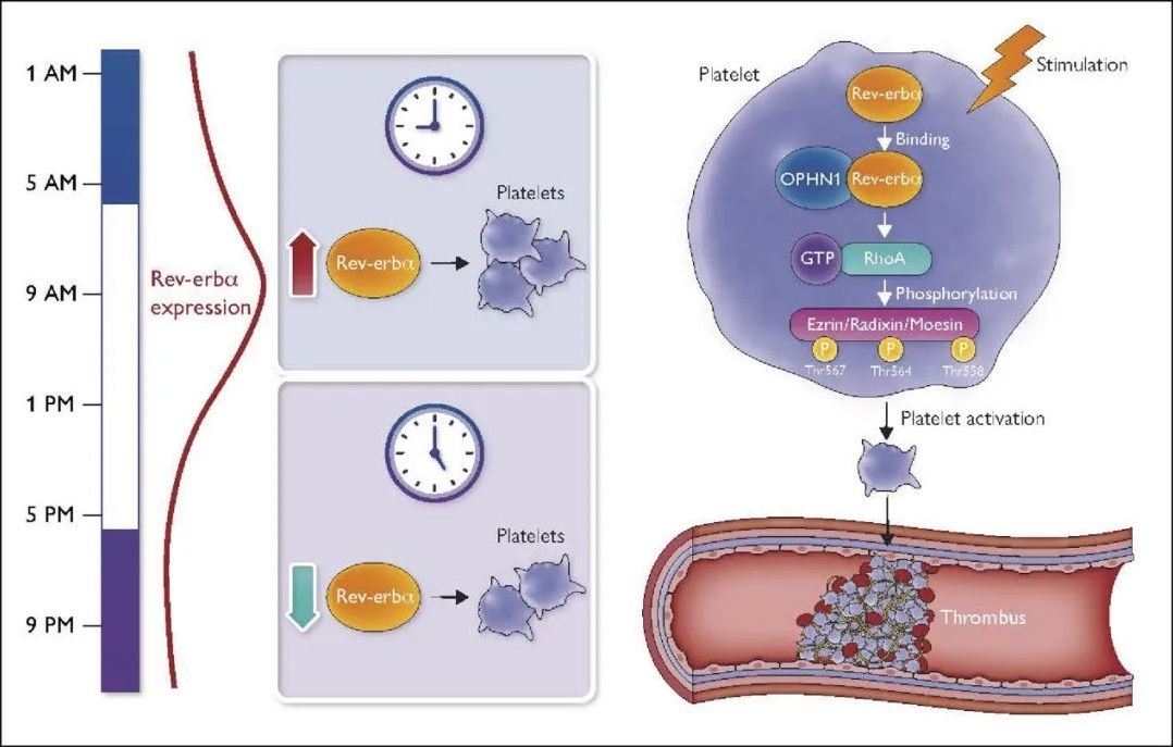 研究者在临床研究中发现,人体血小板聚集和血栓形成具有晨峰现象。健康人体血小板中存在一种特殊的、呈现昼夜震荡的生物钟核受体Rev-erbα,驱动了人类血小板聚集和血栓形成的晨峰现象。生物钟核受体活化在高凝患者的血小板中具有昼夜震荡,在血栓形成中发挥关键作用。